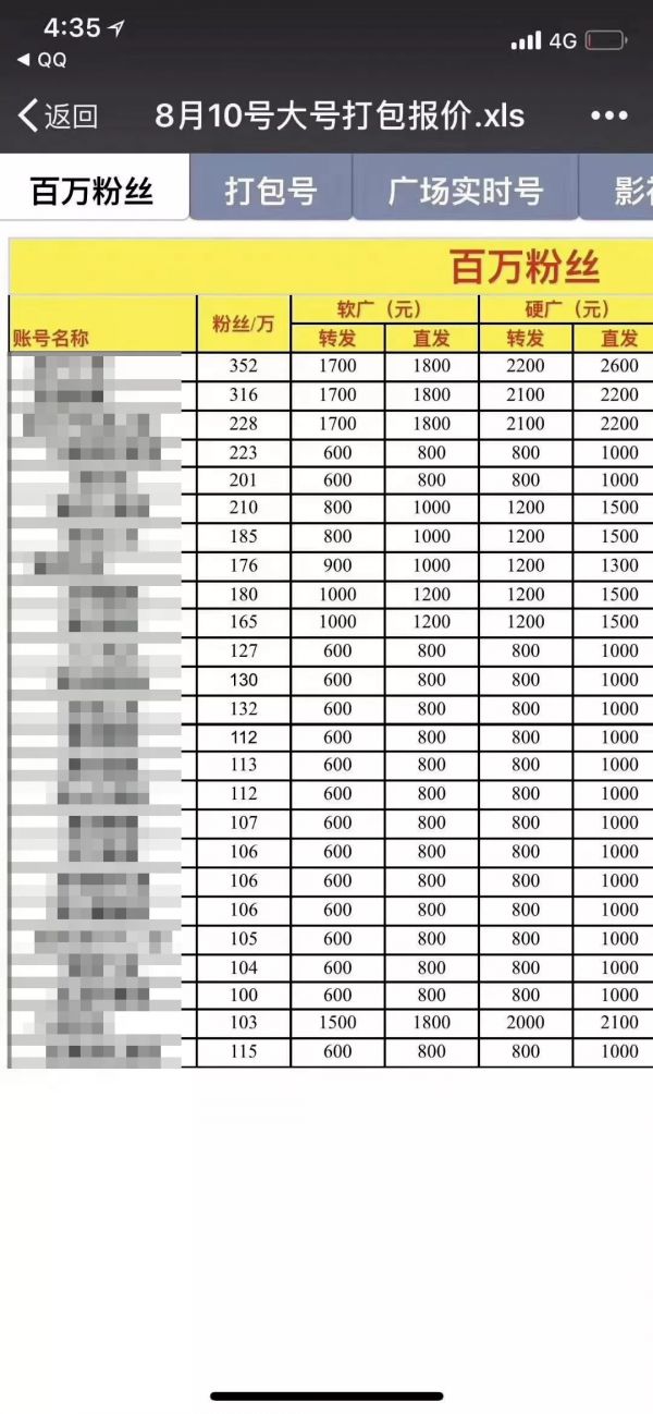 据新京报记者统计,三份表格共含有292个微博账号。其中粉丝数量最多的为“旅行手册”的账号,粉丝381万,营销价位按类型在1700元到2600元不等,认证信息为“知名旅游博主”。