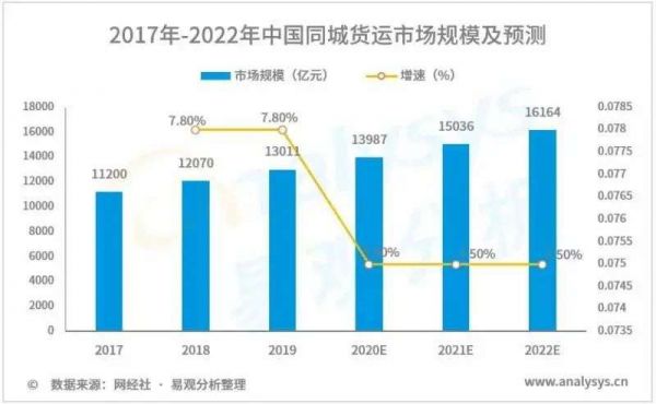 据易观数据显示,移动互联网时代同城货运量从2014年的70亿吨到2020年超过百亿吨,同比增长率超42.9%;市场规模从2014年的8000亿扩大到2020年万亿以上,以每年7%的速度迅速扩大,预计2020年后的市场规模增速将稳定在7%以上。