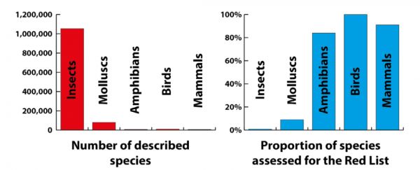 图 | 红色名录中的物种类别存在偏倚。(左)来自 2019 年和 2021 年的两篇科研论文中,选定的主要脊椎动物和无脊椎动物群中的物种总数,与(右)红色名录中评估的这些物种的比例明显不同。(来源:该论文)