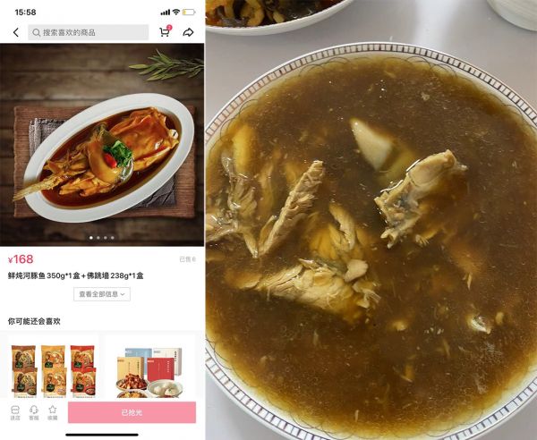 收到后,W把锡纸包加热后倒进盘子里,眼前的景象让她说不出话来。和直播间装在精致磁盘里的完整河豚鱼相比,眼前这盘甚至看不出是一条鱼。