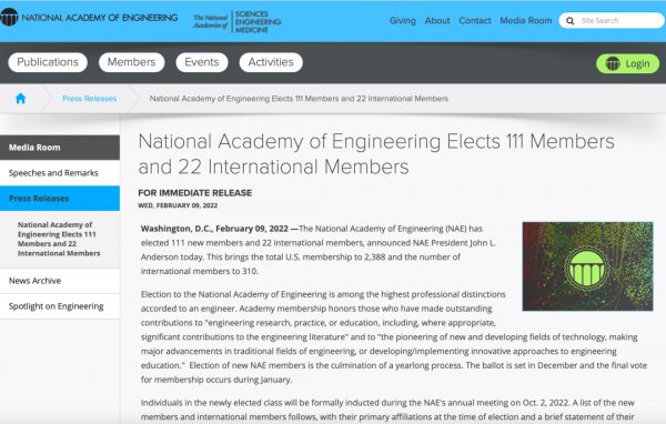 而入选美国国家工程院院士,是工程界最高专业荣誉之一,以表彰那些在“工程研究、实践或教育方面做出突出贡献的人,包括在适当情况下对工程文献做出重大贡献的人”,以及在“开拓新的和发展中的技术领域,在传统的工程领域取得重大进展,或制定/实施创新的工程教育方法的人”。
