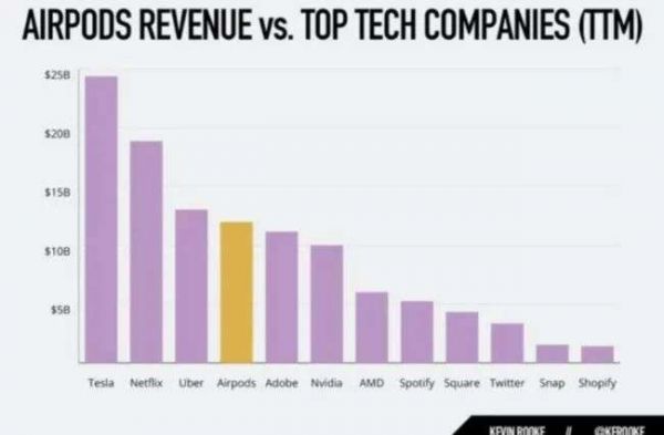 在2019年有数据显示,AirPods的利润就超过了整个小米公司。有数据显示,Airpods每年可带来的收入,几乎是Adobe和Uber的总收入的两倍,是AMD 2020年的收入的两倍。