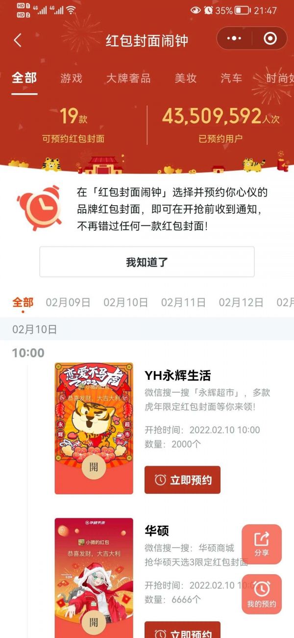 如果说腾讯文档的形式显得庞杂,你还可以专为某个红包封面定制闹钟。红包封面闹钟的页面内,官方将品牌分为了游戏、大牌奢品、美妆、汽车、生活服务、智能数码等8个类别,用户可以预约次日即将上线的红包封面。
