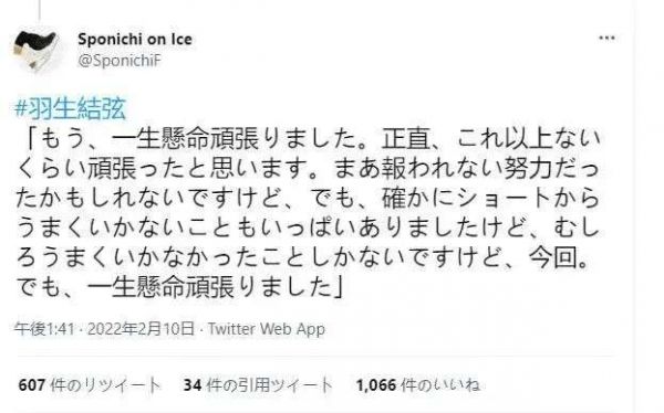 在赛后的采访中羽生结弦说:“我已经拼尽全力了。老实说,已经不能更努力了。也许这份努力没有获得相应的回报,从短节目开始就有很多不顺之处。但是真的已经拼尽全力了。”