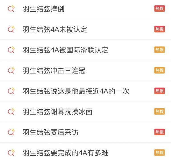 不过,今天的比赛再次将羽生结弦送上微博热搜——“羽生结弦摔倒”、“羽生结弦冲击三连冠”、“羽生结弦要完成的4A有多难”“羽生结弦已经尽力了”,甚至一度出现了#4A是属于羽生结弦的英雄主义#的微博话题,以及整个热搜榜有两个羽生结弦的词条显示“爆”。