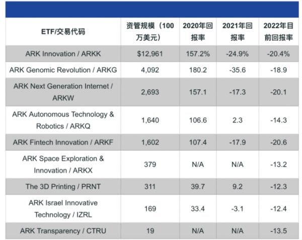 疫情暴发后,2020年许多新兴技术的采用速度加快,创新型公司股票大涨,方舟5只主动管理型ETF当年的平均回报率为142%,吸引了200亿美元的巨额资金流入,2021年前两个月又吸引了170亿美元资金流入。但方舟的基金在2021年2月触及峰值后,形势急转直下,通胀迅速升温和美联储加息前景降低了方舟投资对象的吸引力,2020年飙升157%后,ARKK在2021年下跌了25%。