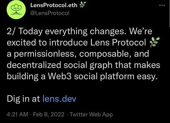 根据Lens Protocol在推特上的介绍,这些NFT可以用于管理粉丝,甚至可以在市场上交易。NFT,即非同质化代币,它在Web3社交平台中可以是一个段子、一张图片、一篇文章。只不过你在Web3社交平台发布的每篇原创文章NFT或者图片NFT,都只有一份,只要你第一个上传,没人能够抄袭你发布的内容。如此,你发布的内容就成为你的资产,如果有人想要使用你的内容,你可以设置它的使用范围、如何使用。