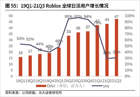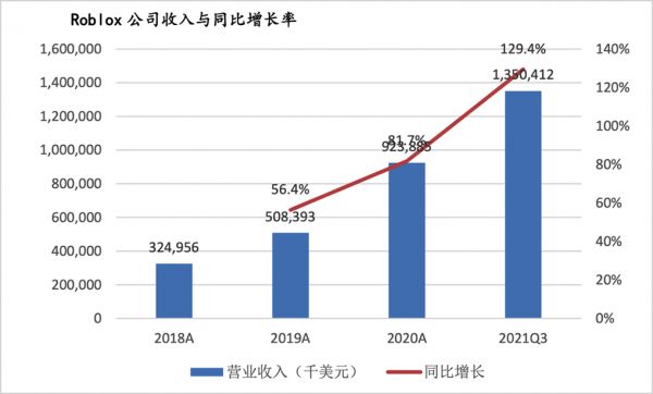 在疫情爆发的2020年,Roblox用户数陡增。截至2021年前三季度,公司DAU达到4730万个,总用户时长超过118亿小时。