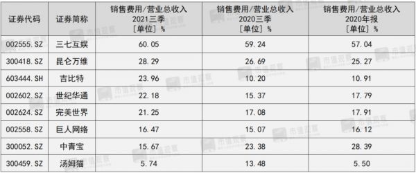 A股规模较大的几家游戏公司,其2021年前三季度销售费用率都有所上升,规模最大的三七互娱更是高达60%,121亿的营收,将近73亿元都用来市场推广。