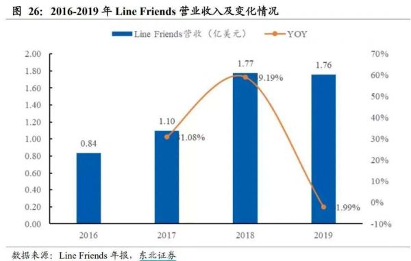 东北证券研报显示,依托于 Line Friends 线上线下的综合打法,公司在2018年营收达到 1.77亿美元,同比增长59.19%。但2019年公司维持原策略,产品力创新不足,线下曝光减少,IP热度降低,导致当年营收下降 2%,广州、深圳、上海等25家实体店因经营不善倒闭。
