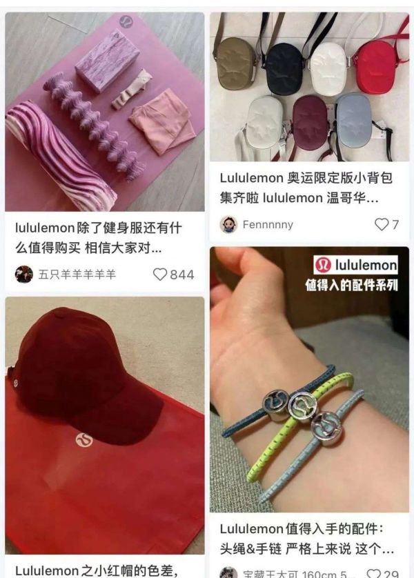 但这并不妨碍lululemon在社交网络上走红。在小红书上,lululemon相关笔记达14万+篇。从发带、头绳、背包、水壶这些小配件,到内衣、帽子、T恤、卫衣、羽绒服等主营业务,可以说lululemon已经成为都市潮人的时尚密码。