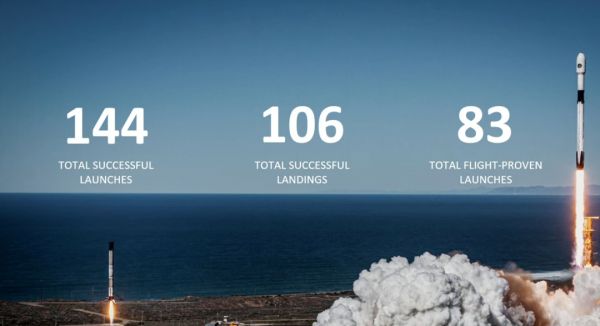 发布会一开始,马斯克就用一张图总结了SpaceX过往的发射成绩:144次成功发射,106次成功着陆,83次重复利用发射。