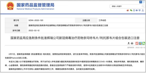 据国家药监局官网,附条件批准辉瑞公司新冠病毒治疗药物奈玛特韦片/利托那韦片组合包装(即 Paxlovid)进口注册。同时,国家药监局要求辉瑞继续开展相关研究工作,限期完成附条件的要求,及时提交后续研究结果。