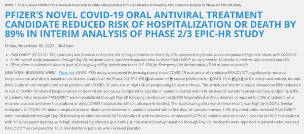 去年 11 月 5 日,辉瑞披露新冠口服药 Paxlovid 的 II/III 期临床试验中期数据结果:患者的住院或死亡风险降低 89%。
