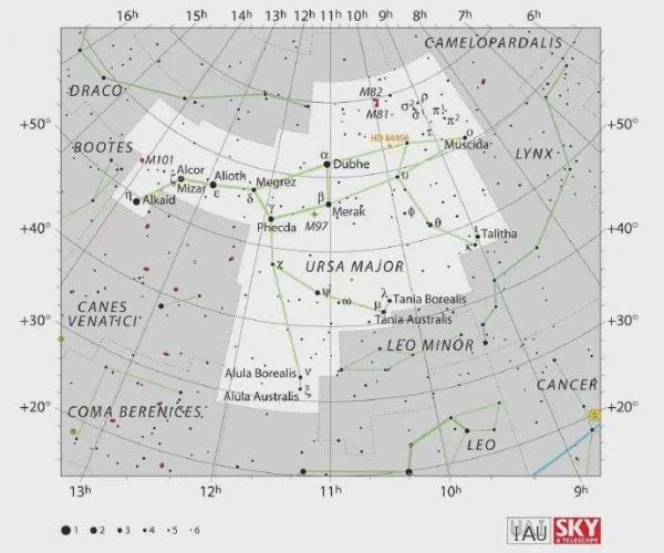 橙色标记的地方就是北斗七星附近那颗恒星|Wikipedia/IAU/Sky & Telescope/Sinnott & Fienberg