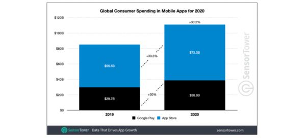 可以说,在互联网时代谁的平台大、谁的推广渠道价值更高,谁就有可能依靠“收租”经济去赚取更多利润。以苹果App Store为例,根据Sensor Tower的数据显示,2020年App Store收入达到723亿美元,远超谷歌Play Store的386亿美元,主因是App Store的渠道价值更高,安卓生态内除谷歌外还拥有Aptoide等应用商店,更多的推广渠道分散了广告主和软件开发商的撒币方向。