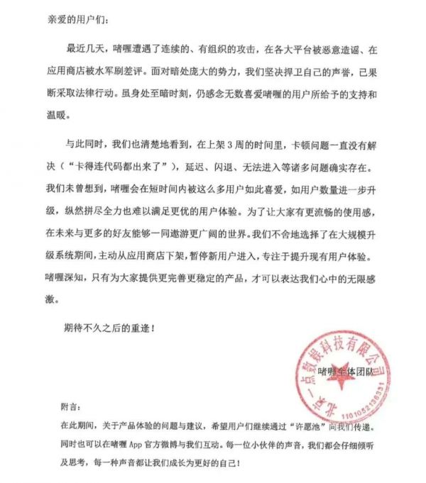 2月13日,啫喱App 发布声明,表示最近几天,遭遇了连续的、有组织的攻击,在各大平台被恶意造谣、在应用商店被水军刷差评。面对暗处庞大的势力,坚决捍卫自己的声誉,已果断采取法律行动。并表示,在上架3周的时间里,卡顿问题一直没有解决,延迟、闪退、无法进入等诸多问题确实存在。为了让大家有更流畅的使用感,啫喱选择在大规模升级系统期间,主动从应用商店下架暂停新用户进入,专注于提升现有用户体验。