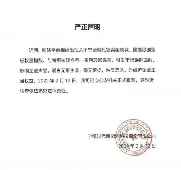 2月13日,宁德时代在微信公众号发布声明称,近期,网络平台相继出现关于宁德时代被美国制裁、被剔除创业板权重指数、与特斯拉谈崩等一系列恶意谣言,引发市场误解曲解,影响企业声誉。谣言无事生非、毫无根据,性质恶劣。为维护企业正当权益,2022年2月12日,公司已向公安机关正式报案,将对造谣者依法追究法律责任。此外,特斯拉有关负责人2月13日回应称,“和特斯拉谈崩,确实不属实。”(金融界)