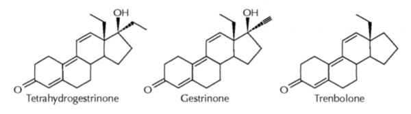 THG(左)、孕三烯酮(中)和群勃龙(右)的结构非常类似,目前均被列入 WADA 禁用物质清单(图源:参考文献[4])