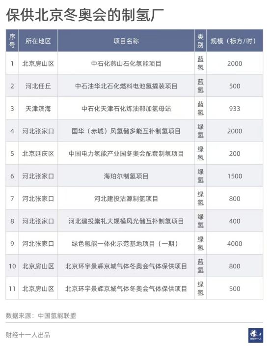 此次冬奥会期间,北京和北京周边共有11座制氢厂投入保供。其中,规模最大的两座制氢厂是张家口绿色氢能一体化示范基地项目(下称张家口绿氢项目)和中石化燕山石化北京冬奥会氢气新能源项目(下称燕山石化氢能项目),产品分别为绿氢和蓝氢。