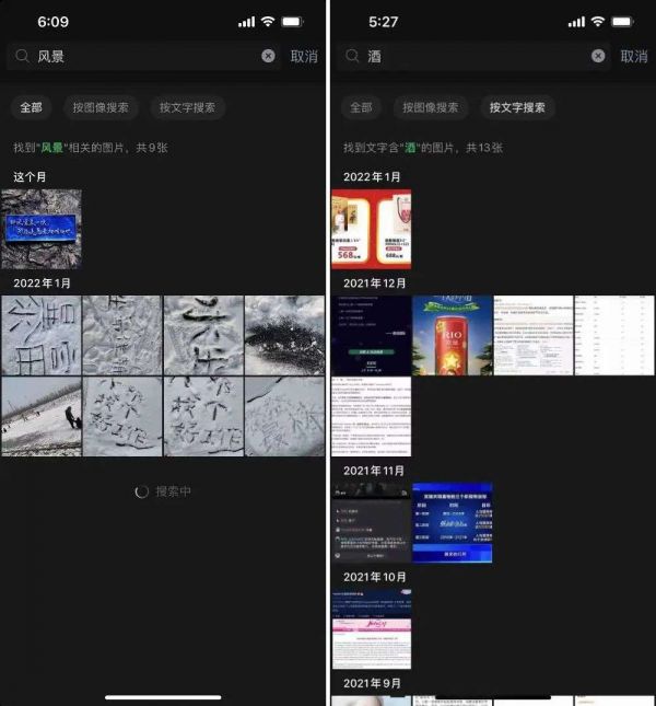 搜图片可以把所有包含食物的图片都找出来,不过中间也会错误地纳入一些看似是食物但并不是食物的卡地亚广告;搜索二维码也能将所有含有二维码的图片直接找出来,不需要一个个翻,搜截图也能直接将某种类型的图片找出来;不过最高效的还是直接搜文字,只要图片上有这几个字,直接搜到图片的时间缩短了不少。