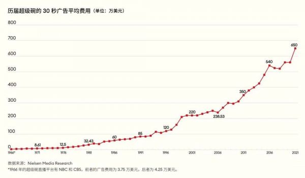 除了球队夺冠,超级碗广告也是备受品牌商和民众关注的焦点,而前者为了曝光更是不惜血本。负责对本次超级碗进行直播的NBC(美国全国广播公司)表示,其在2月初已经卖掉了超级碗的所有广告位,而一些30秒广告的售价达到了创纪录的700万美元。相比之下,在1967年的首届超级碗中,一则广告的平均售价为3.75万美元。