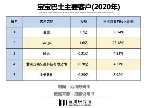 据招股说明书披露, 2019年到2020年,公司向百度的销售比例占到总销售额的50%以上。百度在国内的广告联盟中已是龙头,谷歌在海外也是巨无霸级别的广告商,宝宝巴士的主要营收来源虽说是这些广告联盟,但它们的定位是“广告中介”,因此,也不存在所谓的单一客户占比过高的问题。
