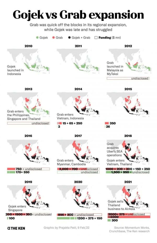 图说:Gojek和Grab的扩张版图对比。来源:The Ken