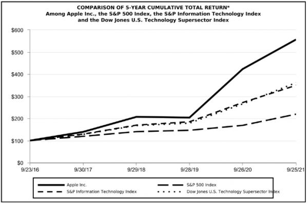 苹果近五年累计总回报跑赢标普500和纳斯达克指数;数据来源:苹果财报