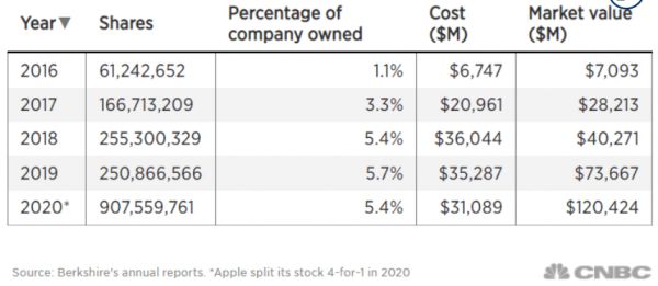 持仓以来,伯克希尔也曾出售部分苹果的股票。2020年,苹果股价腰斩,巴菲特在第三季度略微减仓,获得了110亿美元的收入。截至2022年1月3日,伯克希尔累计持有9.08亿苹果股票,持股比例5.56%,按当日股价计算,持股价值1653亿美元,减去2020年累计投入310.89亿美元,大赚1341亿美元有余,惹得市场羡艳。