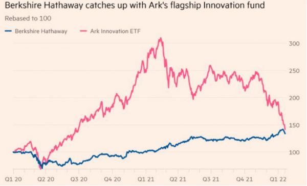 以实例为证,今年以来,看好科技股、有着“女版巴菲特”之称的木头姐凯西·伍德(Cathie Wood)遭遇滑铁卢,在年初的动荡中,巴菲特依然稳坐钓鱼台。此前木头姐旗下六只创新科技型基金一度远超大盘,ARKK自疫情以来也表现卓越,但随着宏观流动性发生变化,伯克希尔公司与方舟创新ETF之间的业绩差距缩小至仅8个百分点。