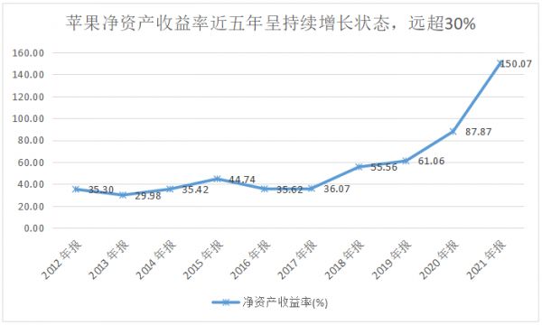 此外,一家企业ROE(净资产收益率)较长时间处于20%-30%可算作优秀企业,而ROE不低于20%且能够稳定增长的企业才能进入巴菲特的投资范围。仔细查看苹果财务指标可以发现,苹果的ROE表现同样惊人,连续五年都超过了30%且持续增长,对选股极其看重ROE的巴菲特而言,这无疑是大大加重了筹码。