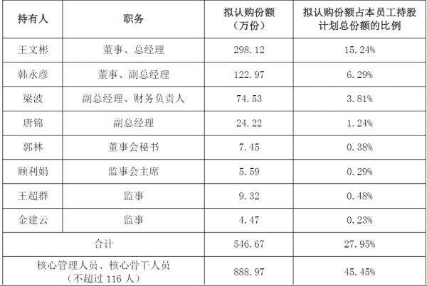 从参与名单来看,公司董事、总经理王文彬成为最大赢家,其拟认购298.12万份,占比达15.24%。