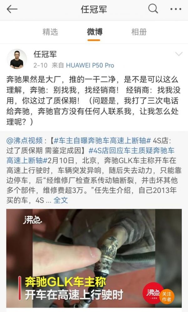 2022年2月10日,微博大V任冠军爆料,称自己的奔驰GLK在高速行驶中出现异响,失去动力,经汽修厂检查是传动轴断裂。对此,任冠军在微博上喊话奔驰,表示:“类似案例在网上一搜一堆,请奔驰给个说法。”