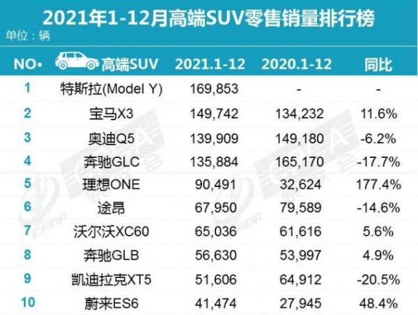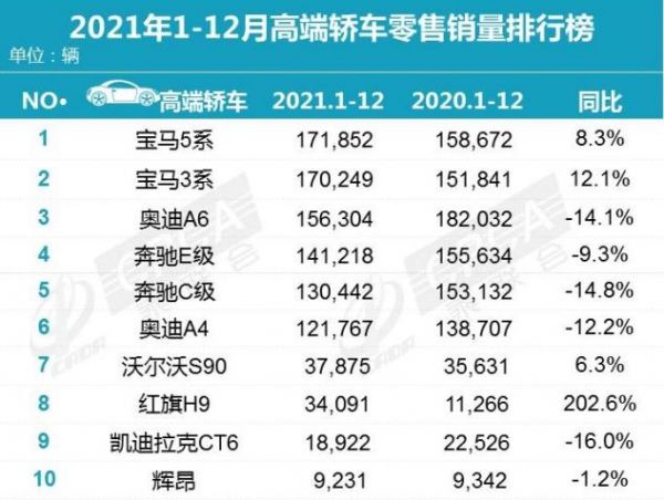根据乘联会信息统计:在2021年的高端轿车零售销量排行榜中,宝马5系增长了8.3%,宝马3系增长了12.1%;在2021年高端SUV零售销量排行中,宝马X3增长了11.6%,理想ONE、蔚来ES6这两款新能源汽车,则分别增长了177.4%和48.4%。