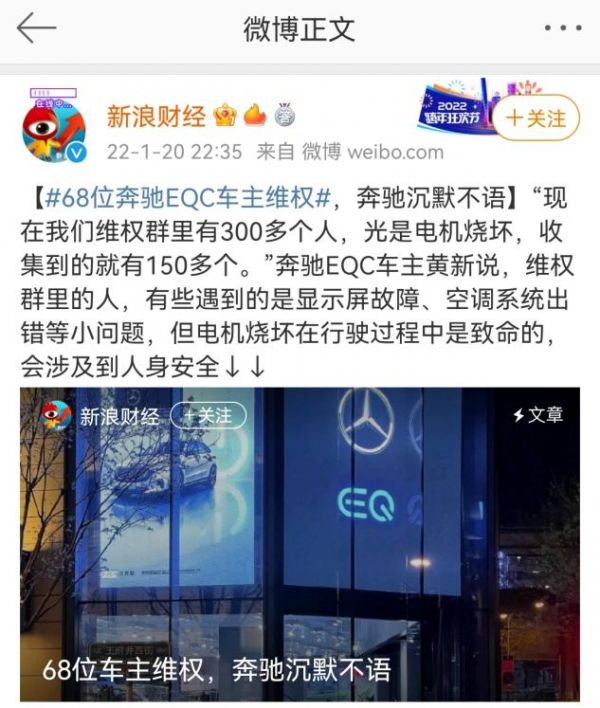 68位奔驰EQC的车主们,近日发表了一份联合声明:表示购买的奔驰EQC车型,出现了电机烧坏、显示屏故障、空调系统出错等问题;并且,在售后维修环节,奔驰的服务相当不到位,影响了车主的用车体验。