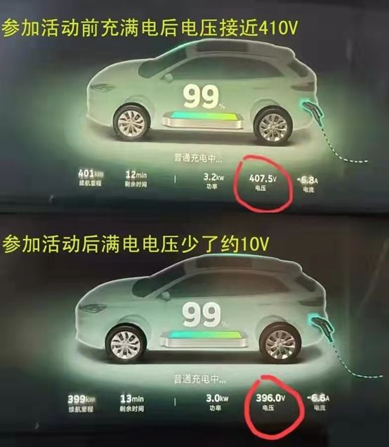 参加完这次活动之后,当电量达到99%之后,车辆显示的电压为396V,比之前同阶段电压少了约10V。