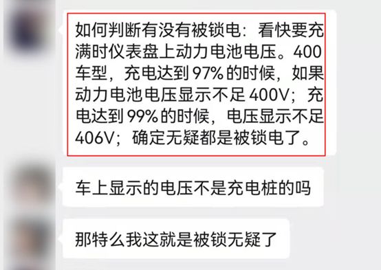 大家总结出来的经验是:判断车辆是否被锁电,要看快充满时仪表盘上动力电池电压。