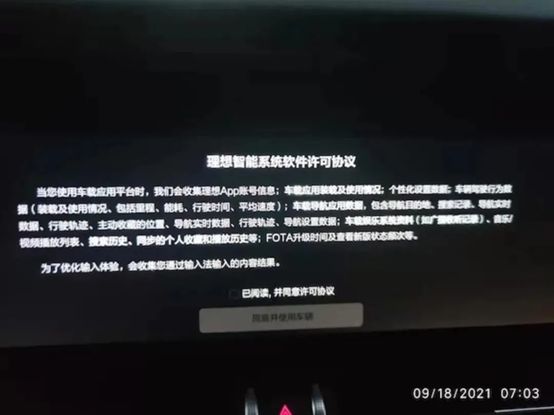 去年9月,有理想ONE车主表示,自己在车机OTA时遭遇了霸王条款。