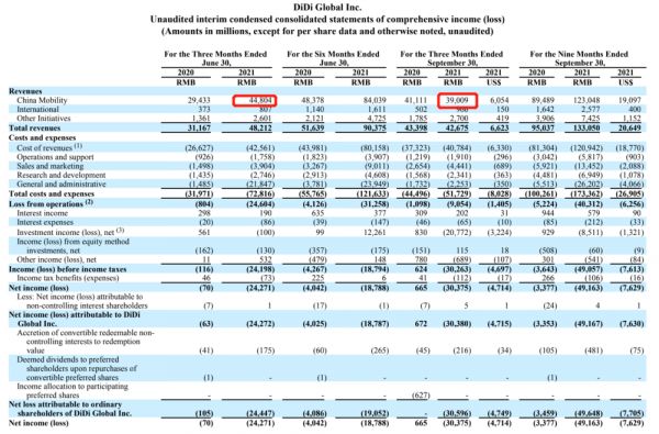 根据滴滴前不久发布的 2021 年第 2 季度和第 3 季度财报数据,能看到,中国出行业务在 2021 年第 2 季度的营收为 448 亿元,但到了第 3 季度营收就下降到了 390 亿元。
