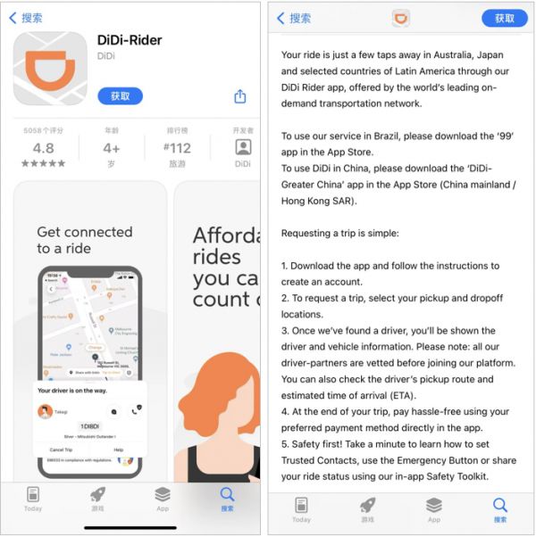 在滴滴应用下架之前,滴滴就曾推出过一款国外版打车软件 DiDi-Rider 。根据 AppStore 里的介绍可知,这款打车软件主要针对的是澳大利亚、日本以及拉丁美洲部分国家和地区,使用方法也和以前的滴滴类似。