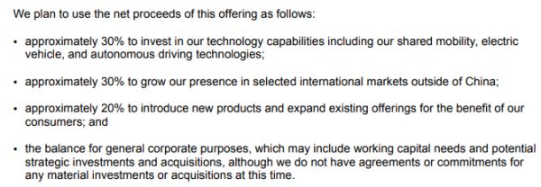 计划将 30% 的 IPO 募资用于提升共享出行、电动汽车和自动驾驶的技术;