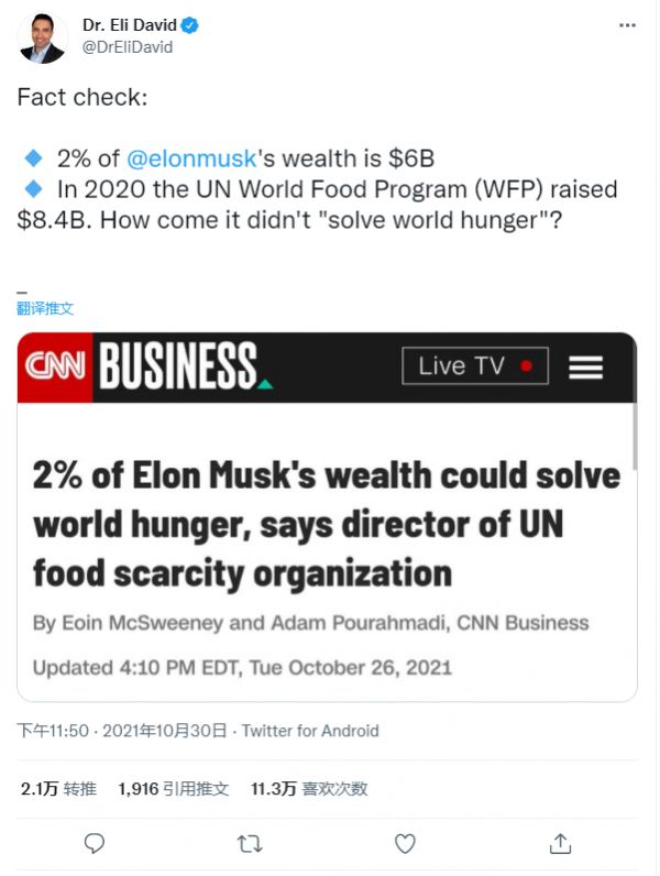 之所以会有这高达数十亿的捐赠,可能还和去年11月的联合国粮食计划署(WFP)署长和马斯克的线上大战有关。