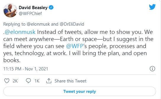 “@埃隆·马斯克,不要再在推特上辩论了,我直接展示给你看。我们可以在任何地方见面——地球、太空都行——但我建议约在可以让你亲眼看看WFP工作现场的地方。 我会给你看我们的计划,以及公开的账本。”