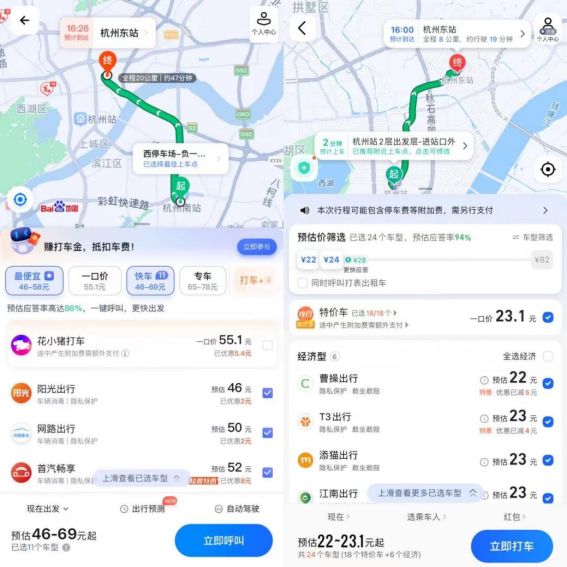聚合打车模式:左百度地图,右高德地图