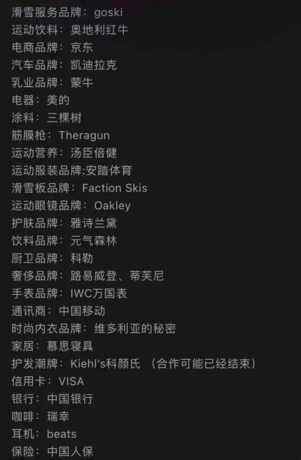 细数这位运动明星代言清单,能发现大量熟知的品牌,涵盖衣食住行几乎没有空缺,而且大都是她在这之前就已经定下的合作。在与滑雪的运动领域,也能看到运动饮料奥地利红牛、运动服装安踏、运动眼镜Oakley的合作,这之外还有个小众领域,定位运动康复设备的筋膜枪。