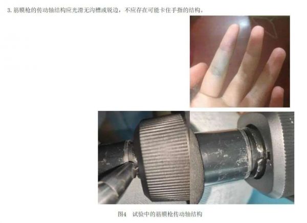 四川省市场监督管理局曾发文警示筋膜枪的安全隐患,指出“不应冲击关节等身体硬处,应避免在关键和脆弱部位使用,同时还应注意控制冲击的时间。”同时还提醒了当前市场环境下可能存在的问题,如电源端子骚扰电压相关隐患,转动轴可能会出现的卡住手指等伤害。