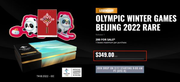 4天前,由国际奥委会官方授权的冰墩墩数字盲盒,在nWayPlay平台正式发售,限量500个,每个99美元,每人限购 5个。截至目前,nWayPlay上一售的冰墩墩数字盲盒早已被哄抢而光,并且换上了新一轮即将发售的传奇版新品预售广告,售价也从原来的99美元,提升到了349美元。