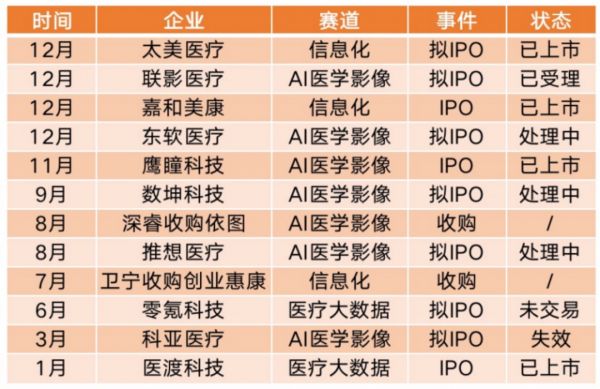 这一年,曾被视为AI医疗“火苗引燃者”的IBM“沃森医生”(Watson)黯然消亡。也正是在这一年,AI医疗扛过资本寒冬,走向IPO前夕。鹰瞳、医渡科技、嘉和美康成功上市敲钟,头部效应初现。深睿、卫宁分别收购依图、创业慧康,企业间开启并购。