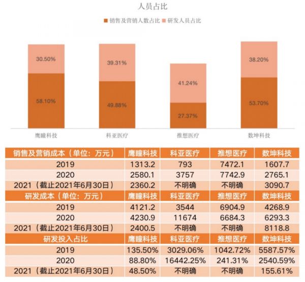 在商业化层面上,除推想医疗外,鹰瞳科技、科亚医疗、数坤科技销售人员占比都高于研发人员占比,同时销售及营销成本也逐年提升。